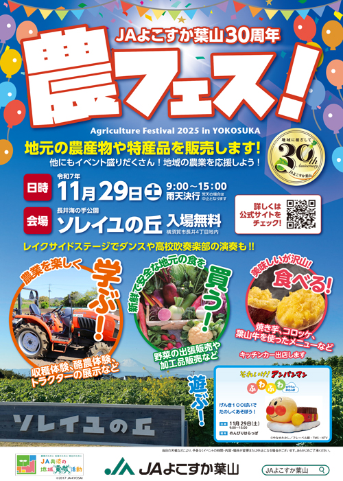 地域に根差したJAとして、組合員・地域の皆さまとともに地域農業をさらに盛り上げるべく、11月29日(土)に「JAよこすか葉山30周年 農フェス」を開催いたします。