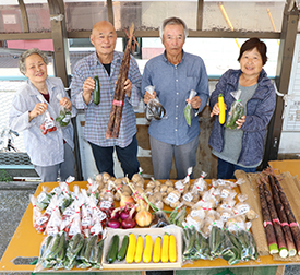 くりはま支店前にある農産物直売コーナーです。地元の生産者が作った採れたての新鮮野菜、柑橘類、花が並びます。季節によって色とりどりの旬な農産物が出荷されますのでぜひお立ち寄りください。